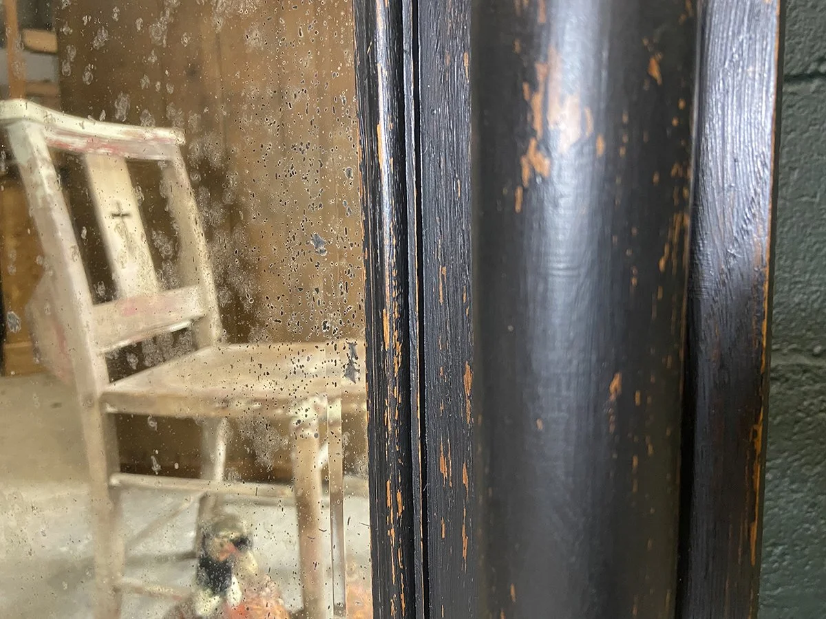 Sympathetically refinished in black with the wood grain coming through in high relief areas.